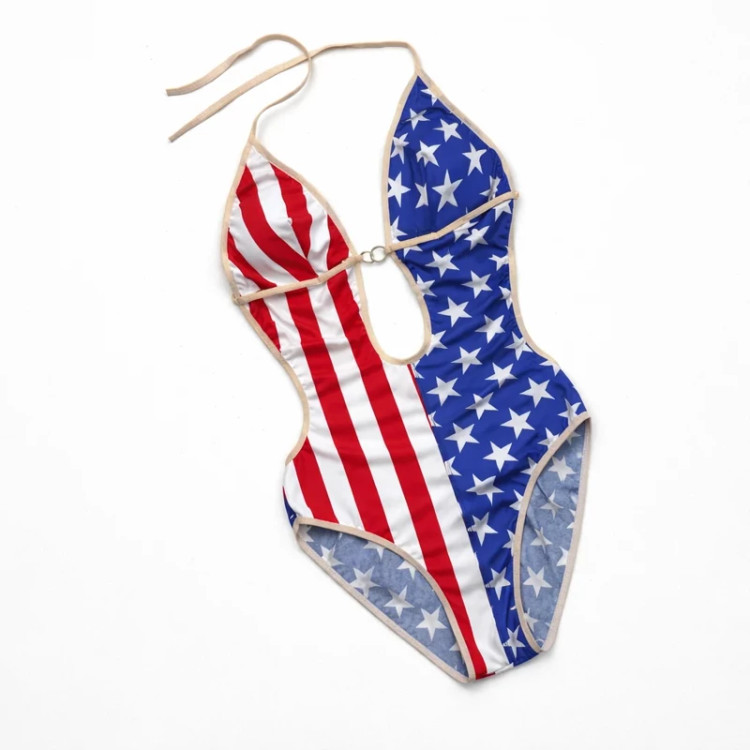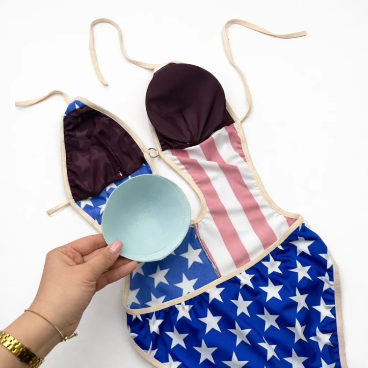 مایو یکتکه پشتباز با طراحی الهامگرفته از پرچم آمریکا، ترکیبی جسورانه از خطوط قرمز و سفید در کنار زمینه آبی با ستارههای سفید است. برش خاص در قسمت جلو با حلقه ظریف فلزی، فرم بدن را کشیدهتر نشان میدهد و طراحی پشتباز آن جلوهای متفاوت و چشمگیر ایجاد میکند. کاپهای داخلی قابل جابهجایی، فرمدهی طبیعی و دلنشینی به سینه میبخشند.