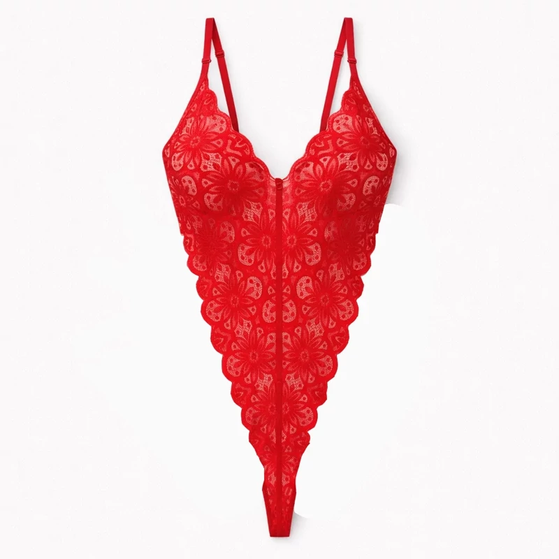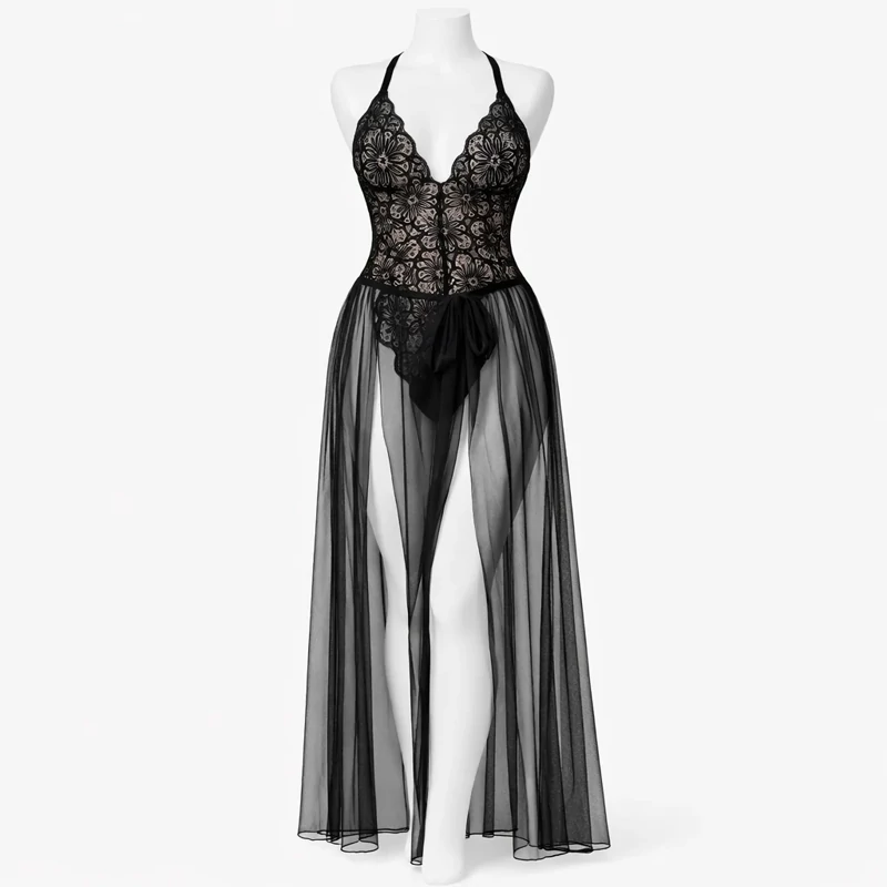 این لباس خواب دو تکه با ترکیب بادی گیپور ظریف و دامن توری بلند، جلوهای لطیف و در عین حال چشمگیر ایجاد میکند. در تصویر، طراحی گلدار روی بادی با برش هفت در قسمت سینه و بندهای نازک قابل تنظیم دیده میشود که همراه با دامن توری بلند و چاکدار، فرم بدن را کشیدهتر و ظریفتر نشان میدهد.