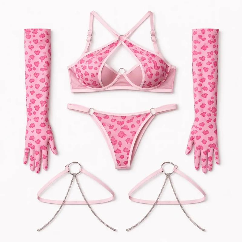 این کاستوم فانتزی با تم صورتی و طرح قلب، ترکیبی از طراحی جسورانه و فرمدهی دقیق است. سوتین فنردار با برشهای ضربدری و حلقه فلزی مرکزی، جلوهای خاص به قسمت بالاتنه میدهد و دستکشهای بلند همرنگ، استایل را کامل و یکدست میکنند. حضور جزئیات فلزی ظریف و بندهای قابل تنظیم، ظاهر محصول را حرفهای و چشمگیر کرده است.