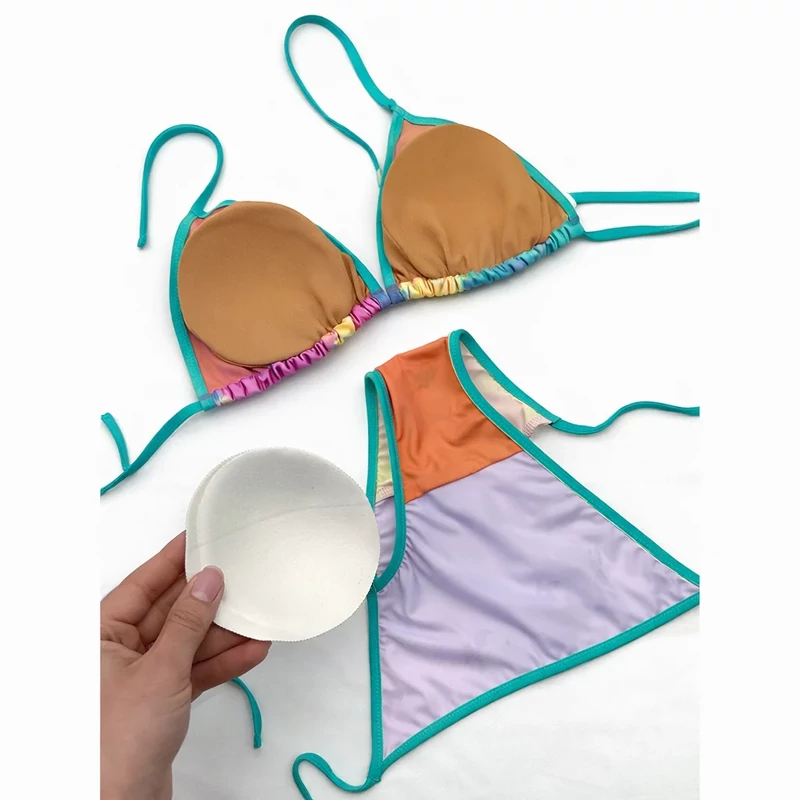 بیکینی دوتکه با طراحی گرادینتی پاستلی، ترکیبی لطیف از رنگهای صورتی، یاسی، زرد و آبی ملایم است که با نوار سبزآبی (فیروزهای) قاب شده و جلوهای شاد و تابستانی ایجاد کرده است. این مدل انتخابی عالی برای استایلهای ساحلی ظریف، دخترانه و ترند فصل گرم محسوب میشود.