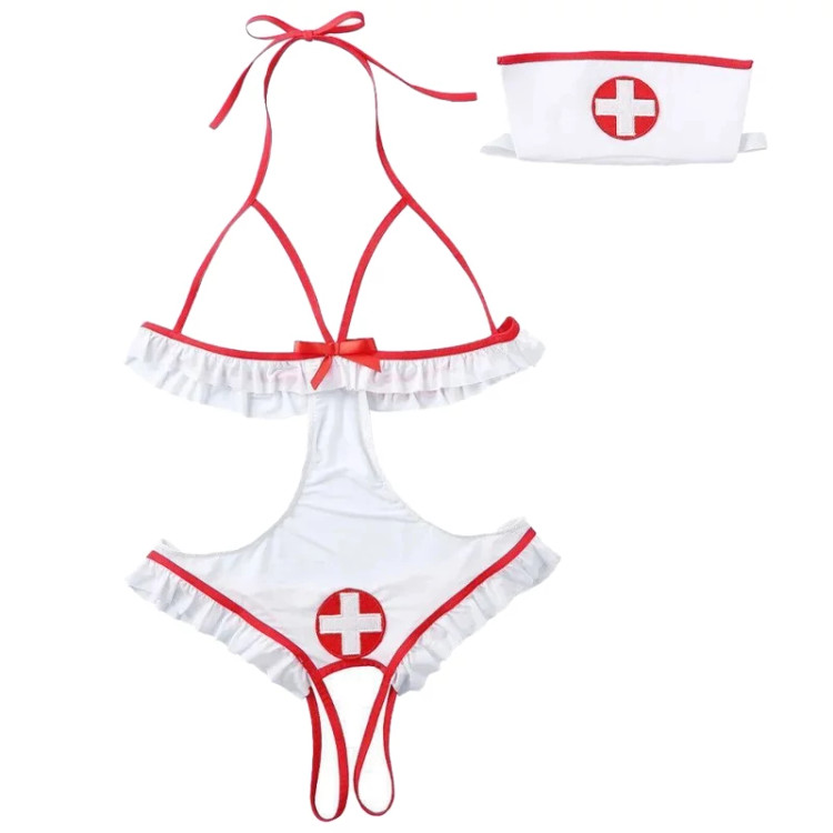 کاستوم پرستاری فاق باز 003 یک ست فانتزی و هیجانانگیز است که با الهام از یونیفرم پرستاری طراحی شده تا لحظاتی خاص و متفاوت را برای شما و شریک زندگیتان رقم بزند. این کاستوم شامل یک بادی یکتکه فاق باز بههمراه هدبند طرح پرستاری است که استایل شما را کاملتر میکند. طراحی باز و جذاب این محصول، ترکیب رنگ سفید و مشکی و دوخت ظریف، جلوهای اغواگر و خاص به آن میدهد. استفاده از پارچه سبک و کشی باعث میشود این کاستوم هم راحتی لازم را داشته باشد و هم بدن را به شکلی زیبا نشان دهد.