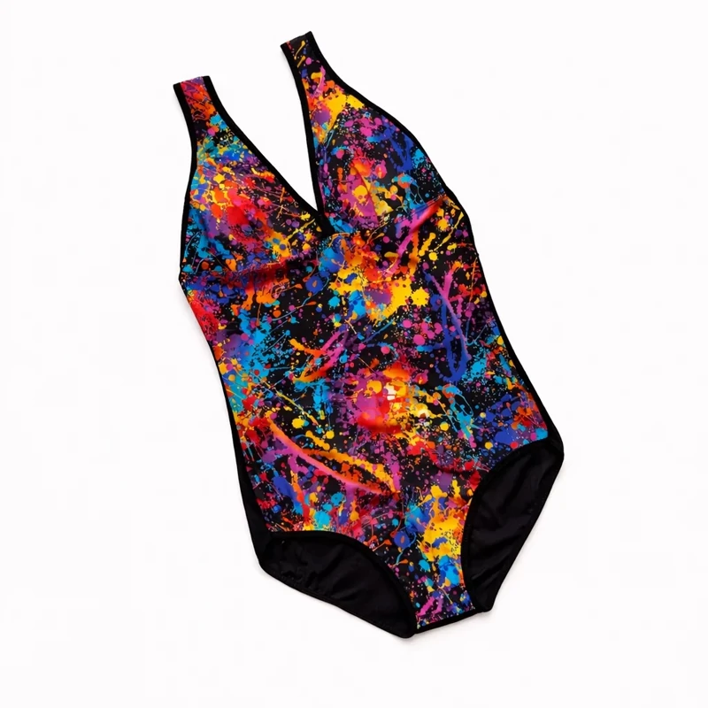مایو یکتکه با طراحی مدرن و انرژیبخش، دارای طرح رنگپاشی نئونی روی زمینه مشکی که جلوهای خاص و متفاوت ایجاد میکند. ترکیب رنگهای زرد، صورتی، آبی و نارنجی در کنار پنلهای مشکی کناری، استایلی اسپرت و در عین حال فرمدهنده به بدن میدهد.